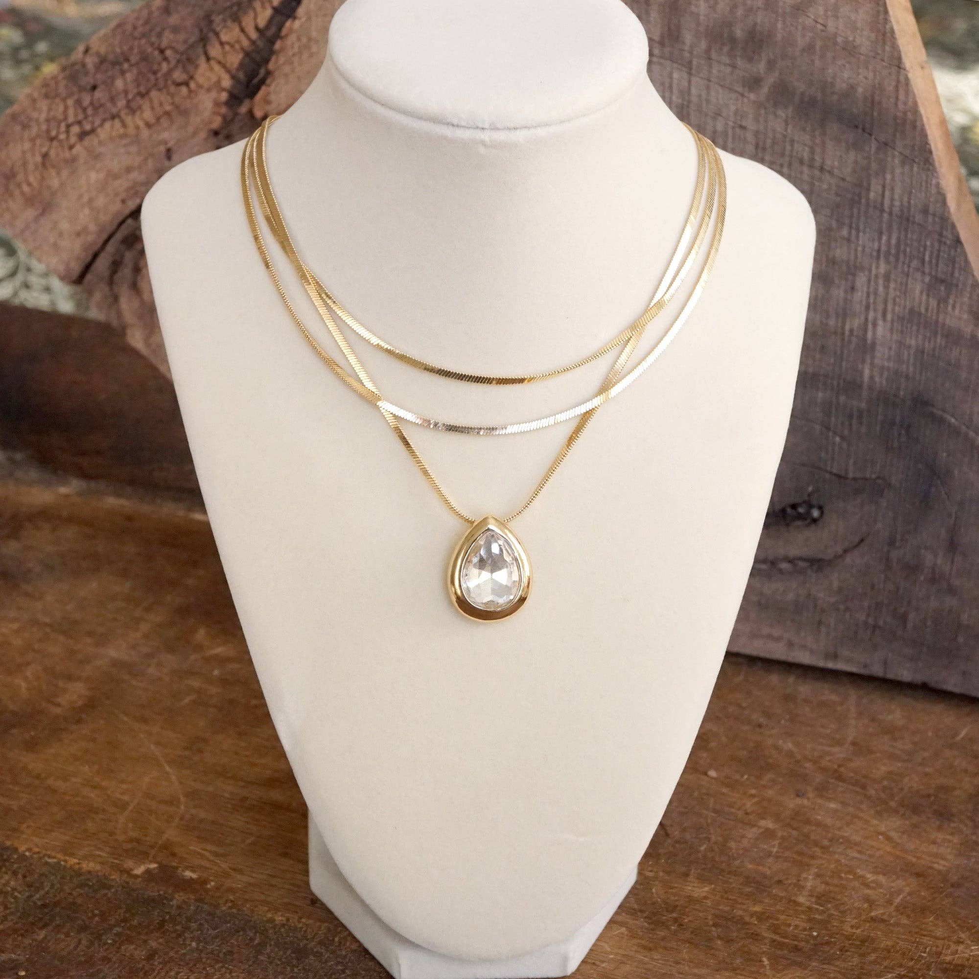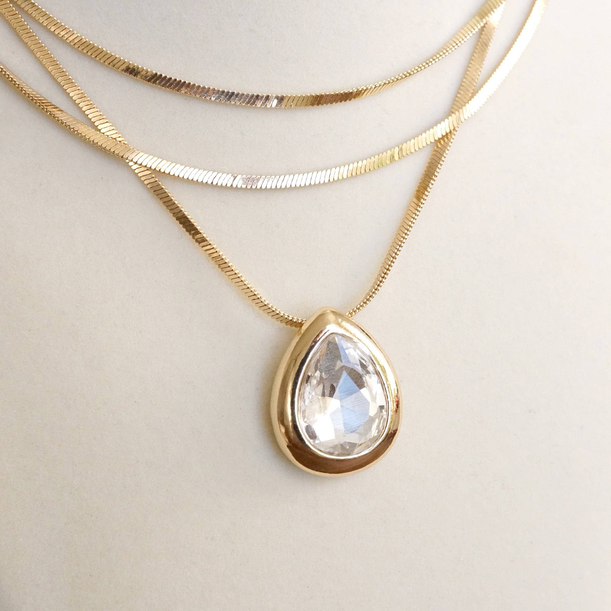 Layered Gold Chain Statement Necklace with Teardrop Crystal Pendant Elegant layered gold tone herringbone chains...